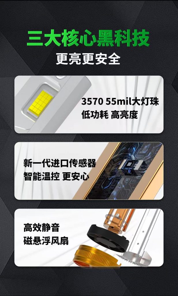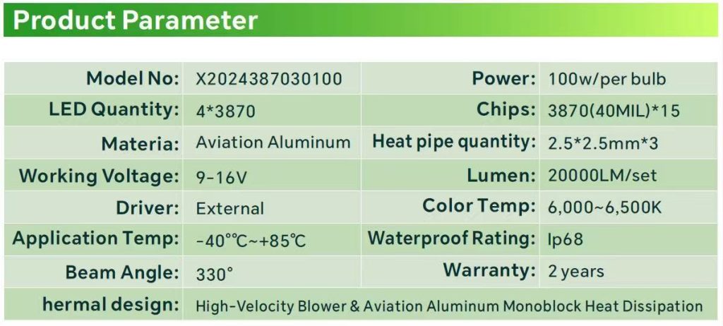 Model No: x2024387030100 LED Quantity: 4*3870 Power: 100w/per bulb Chips: 3870(40MIL)*15 Heat pipe quantity: 2.5*2.5mm*3 Materia:Aviation Aluminum Working Voltage:9-16V Driver:External Application Temp:-40°C~+85℃ Beam Angle: 330° Lumen: 20000LM/set ColorTemp: 6,000~6,500K WaterproofRating: lp68 Warranty: 2years hermal design: High-Velocity Blower & Aviation Aluminum Monoblock Heat Dissipation