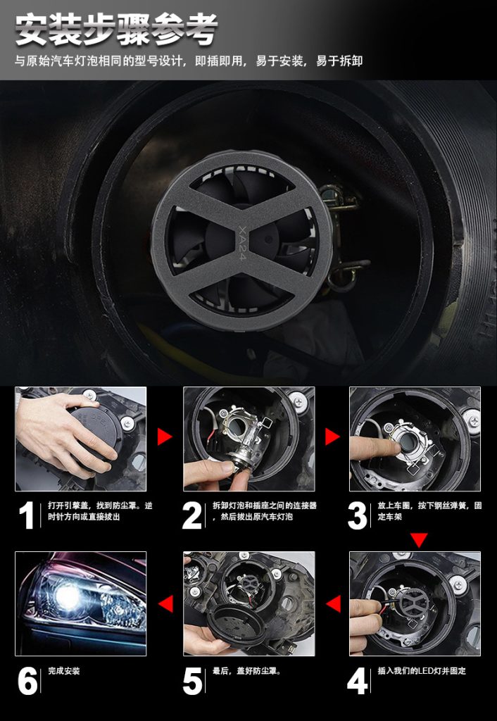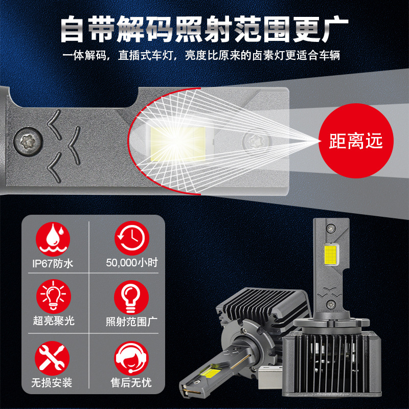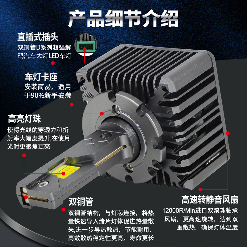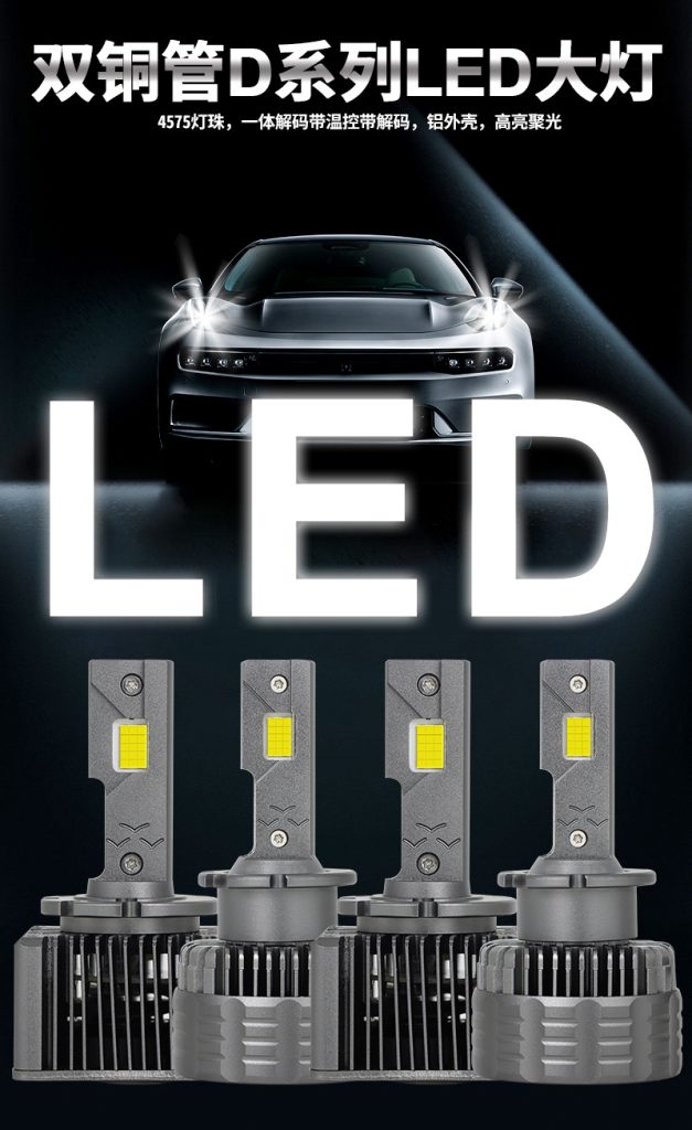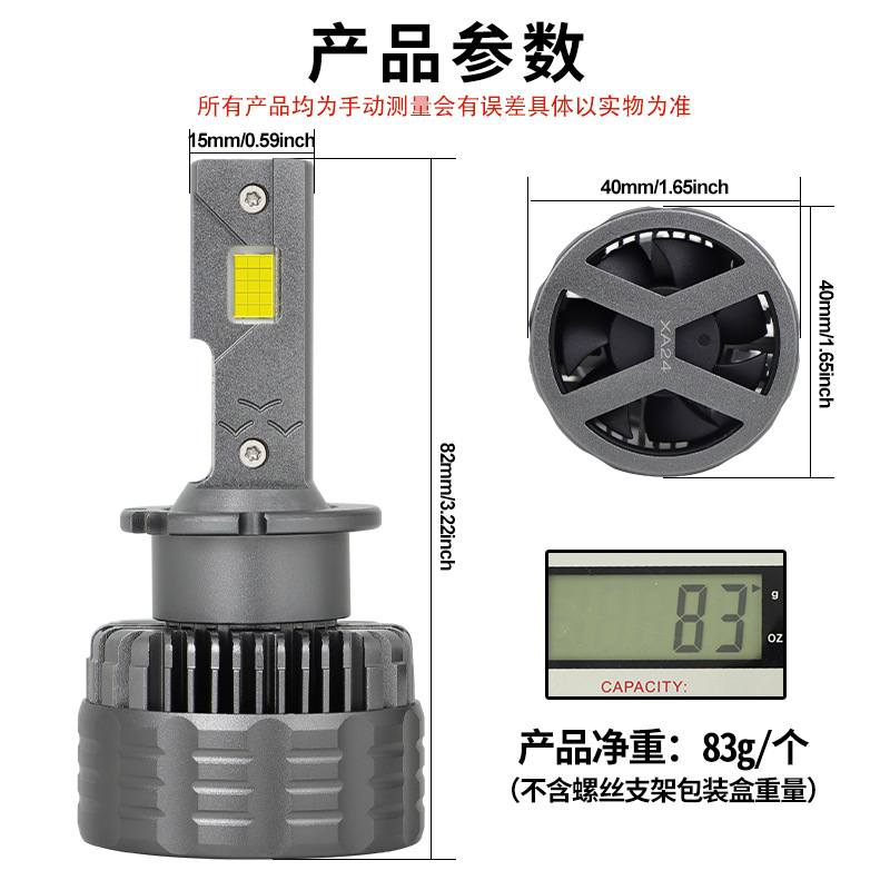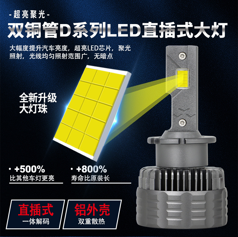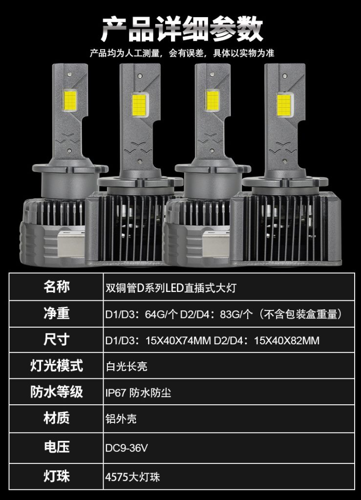 Name:Double copper tube D-series LED plug-in headlight Net Weight:D1/D3: 64GB each, D2/D4: 83GB each (excluding the weight of the packaging box) Dimensions:D1/D3: 15X40X74MM D2/D4: 15X40X82MM Lighting Mode:White light stays on continuously Waterproof Rating:IP67 Waterproof and Dustproof Material:Aluminum casing Voltage:DC9-36V Lamp Beads:4575 Large LED Beads