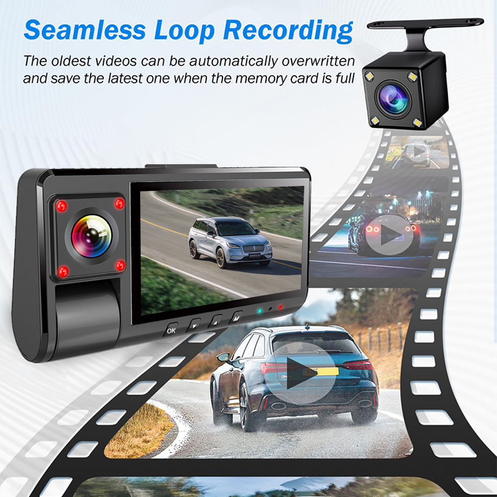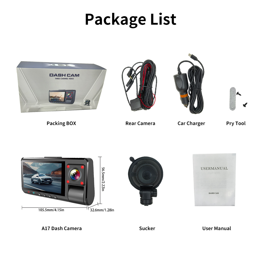 Master Control: JR3292 Lens: GC1084 Screen Size: 3 inch IPS Resolution (Front): 1920 * 1080P Resolution (Interior): 640 * 480P Resolution (Rear): 640 * 480P Working Current/Voltage: 5V/2A Working Temperature: -20°C – +75°C Working Humidity: 15%-60% RH Video Format: AVI/MOV/MP4 TF Card Support: Max 8-128GB Battery Capacity: 150mA WIFI/APP: Optional Color: Black