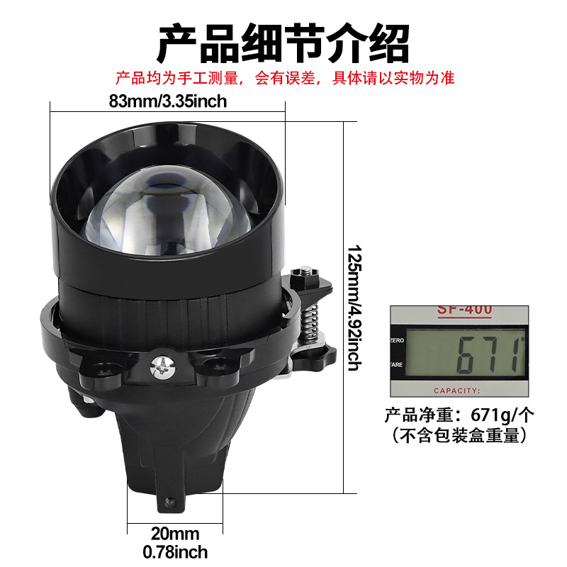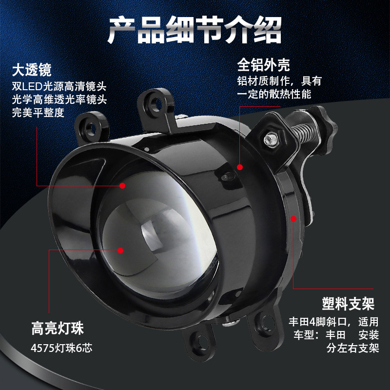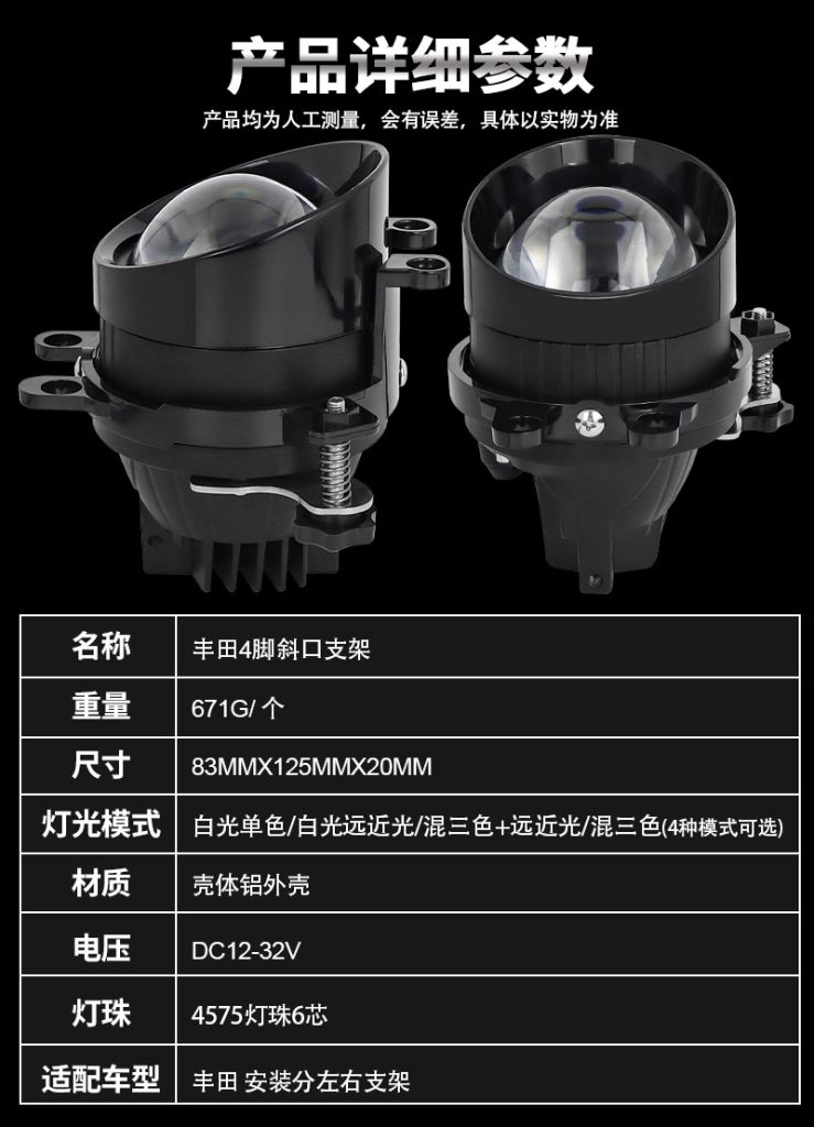 Name:Toyota 4-Leg Angled Bracket Weight:671G each Dimensions:83MMX125MMX20MM Lighting modes:From monochrome/white light high beam and low beam/mixed three-color high and low beam/mixed three-color (4 modes available) Material:Aluminum housing Voltage:DC12-32V LED beads:4575 LED beads, 6 cores Compatible models:Toyota installs left and right brackets