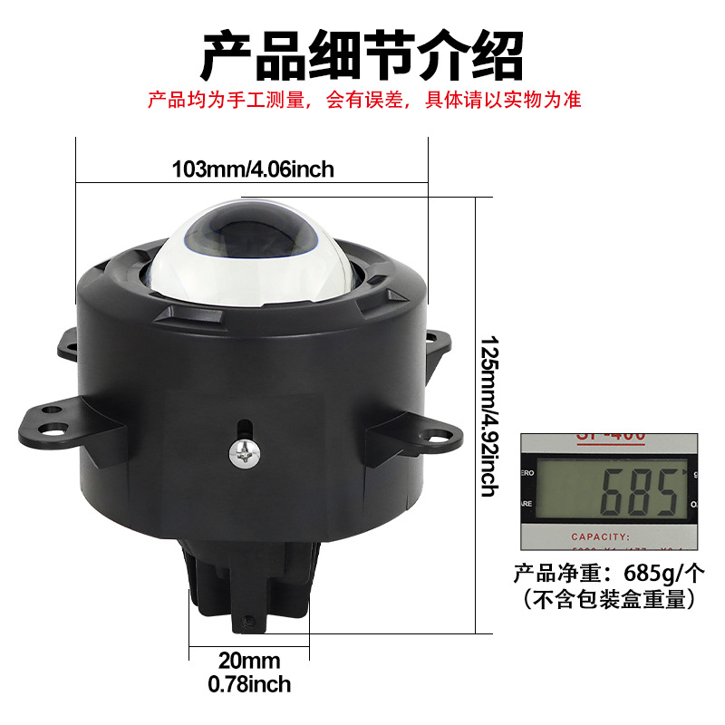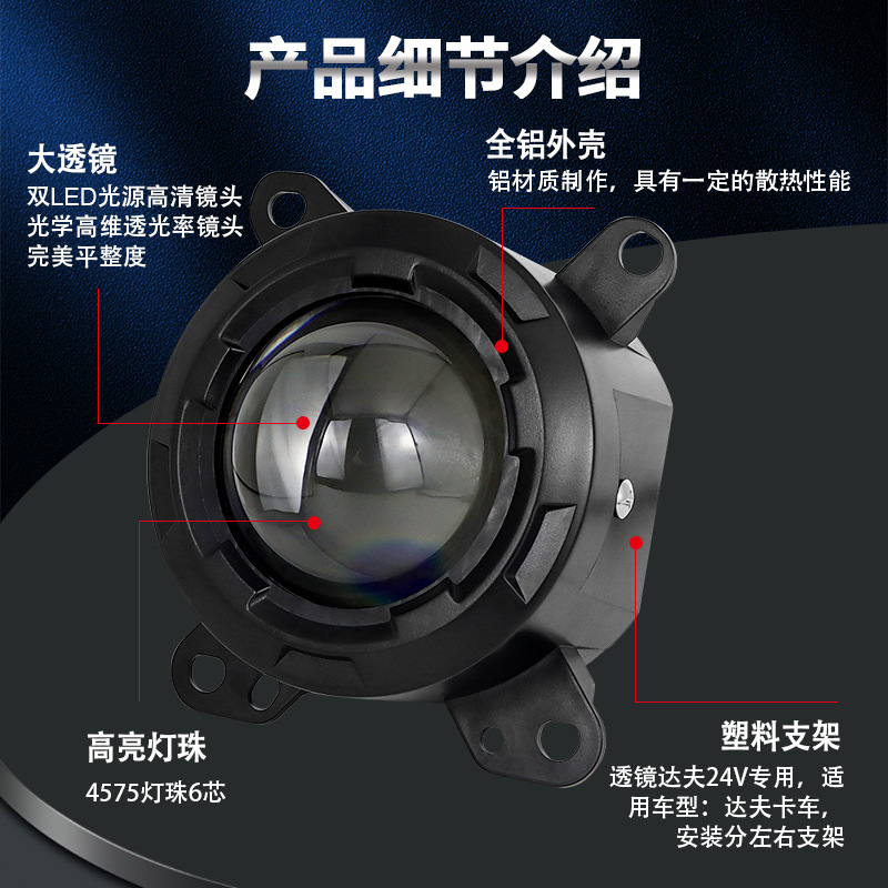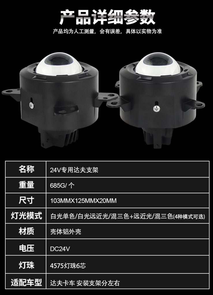 Name:24V Dedicated DAF Bracket Weight:685G each Size:103MMX125MMX20MM Light Mode:From monochrome/white light high beam and low beam/mixed three-color high and low beam/mixed three-color (4 modes available) Material:Aluminum housing Voltage:DC24V LED Beads:4575 LED beads 6 cores Compatible Models:DAF truck installation brackets are divided into left and right
